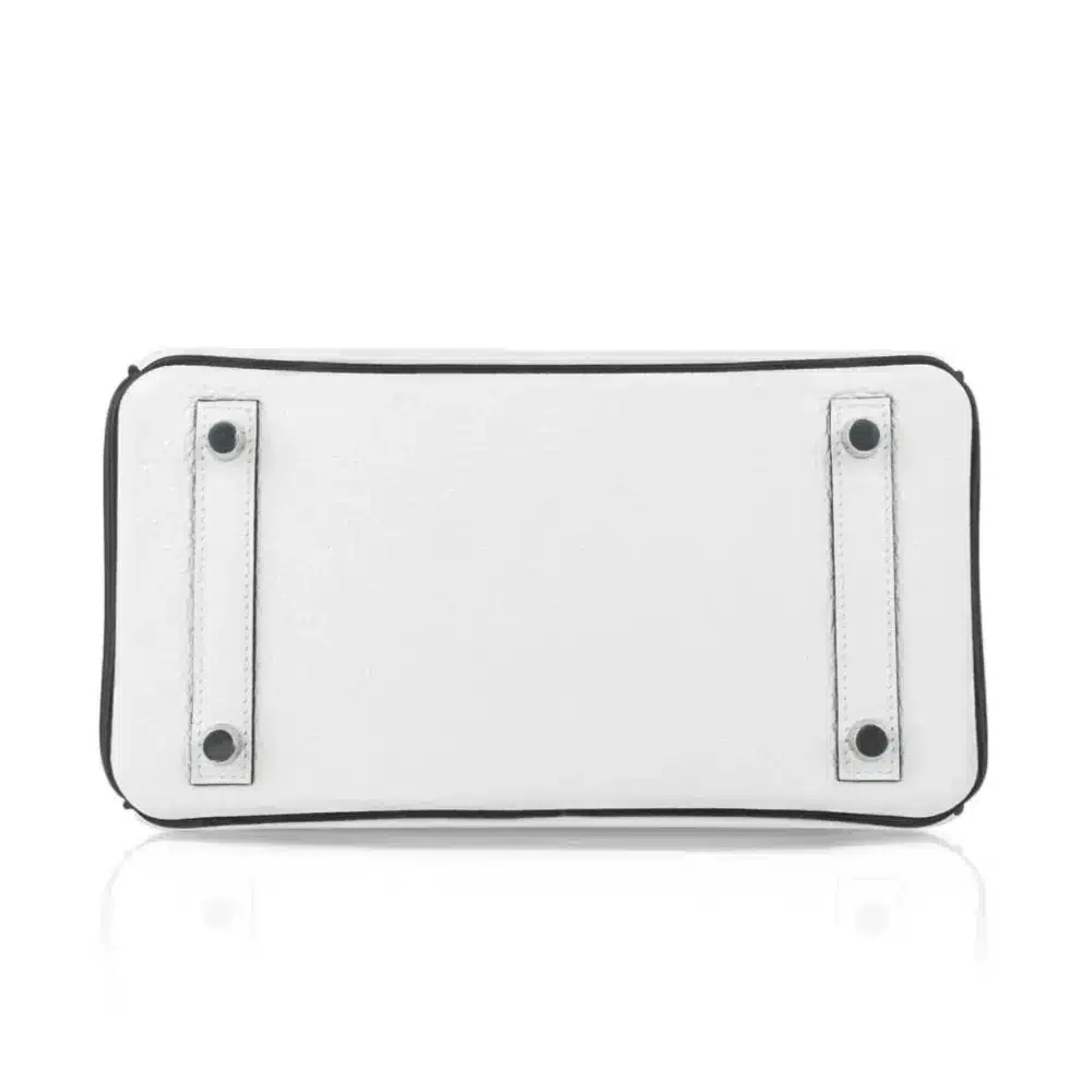 The epitome of “if you know, you know” luxury, this Birkin 25 HSS (Horse Shoe Stamp) is a masterclass in high-contrast sophistication. Reserved for the world’s most discerning collectors, this Special Order piece features a striking bicolor composition of pristine White and deep Black. The choice of Clemence leather provides a heavy, luxurious drape and a matte grain that is remarkably soft to the touch, yet resilient enough for a lifetime of use.