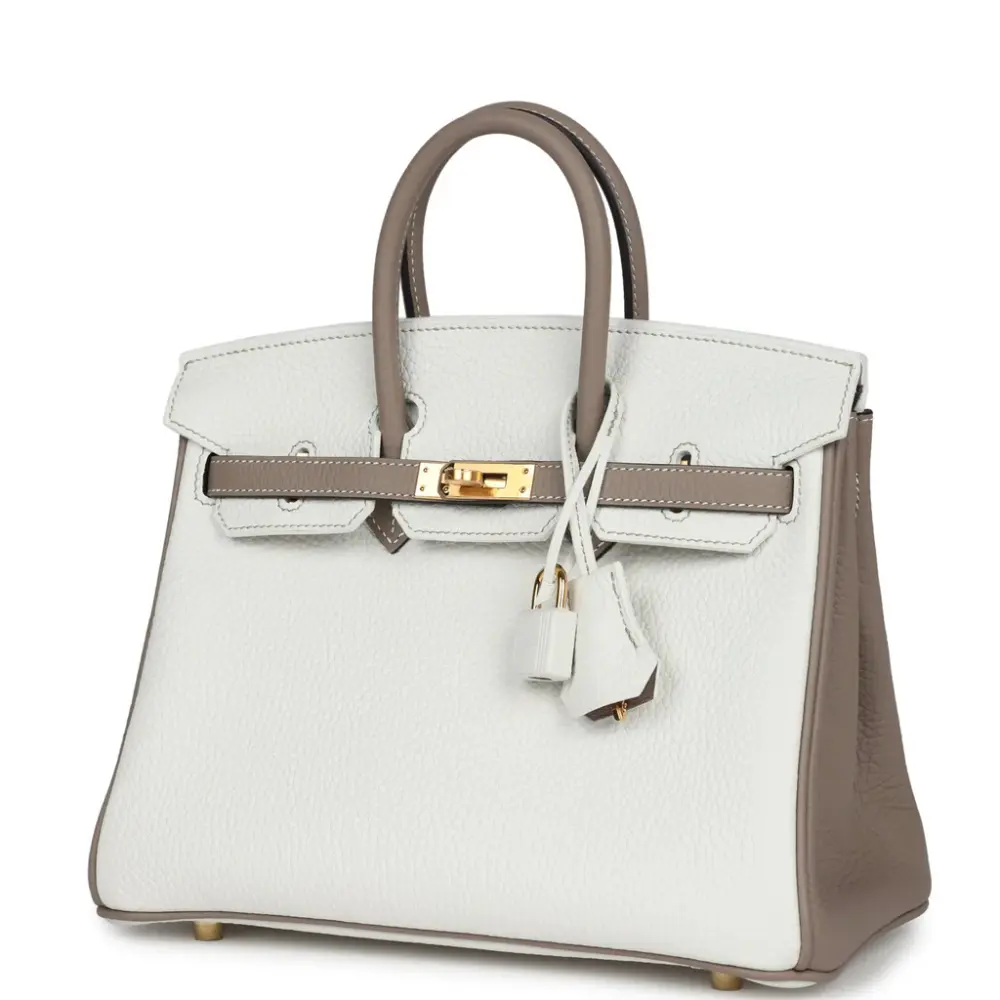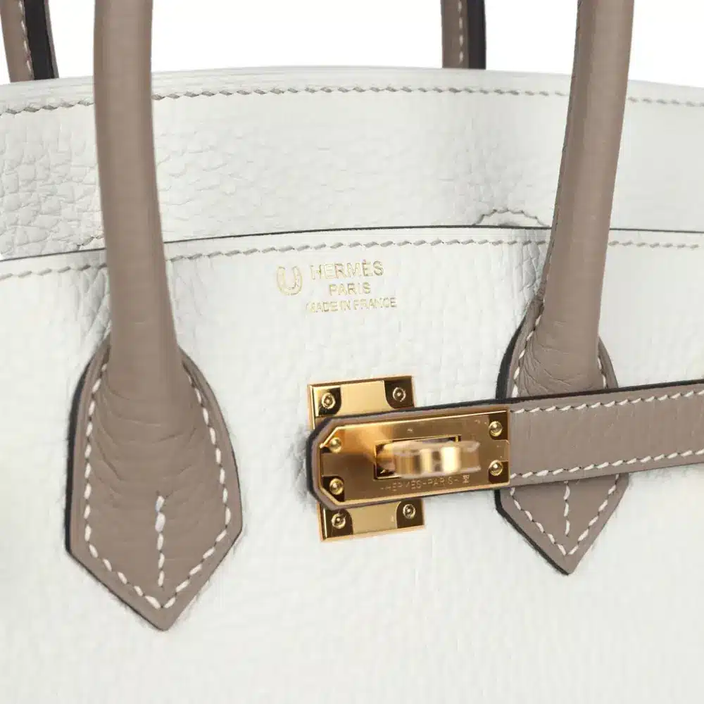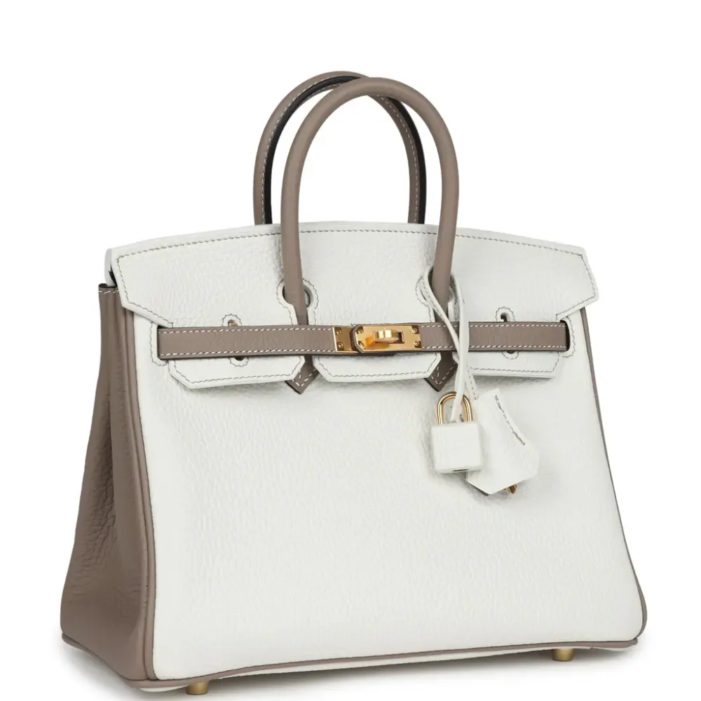 Experience the pinnacle of “Stealth Wealth” with this exceptional Birkin 25. This rare bicolor edition juxtaposes a crisp, architectural White with the muted, earthy sophistication of Gris Tourterelle. Crafted from iconic Clemence leather, the bag offers a heavy, pebbled grain that is both incredibly supple to the touch and remarkably resilient to the rigors of daily use.