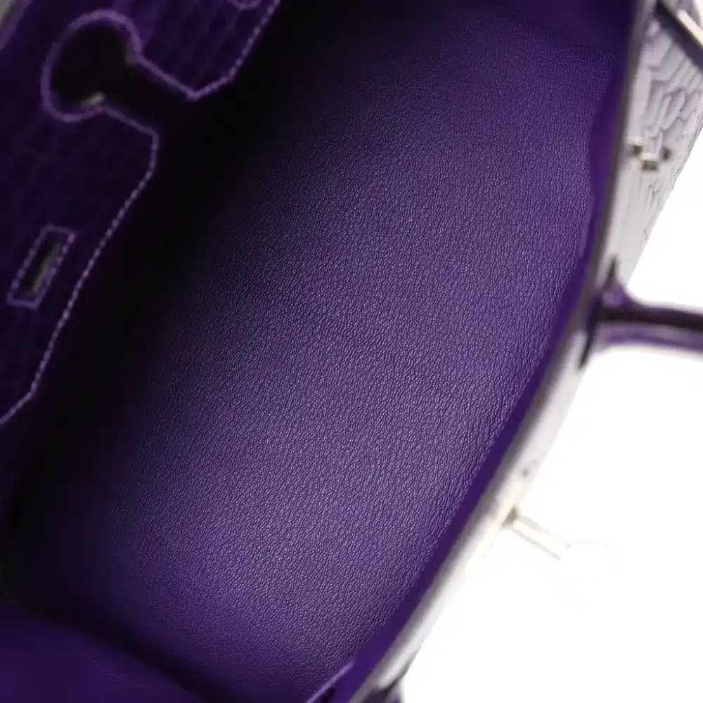 Elevate your collection with “The Amethyst Muse,” a Birkin 30 that transcends mere fashion to become a wearable investment. This piece is defined by its deep, multidimensional amethyst hue, achieved through a meticulous dyeing process that highlights the natural, symmetrical scales of the premium Amethyst Shiny Crocodile. The skin possesses a glass-like luster that catches the light with every movement, signaling a level of “Stealth Wealth” recognizable only to the true connoisseur.